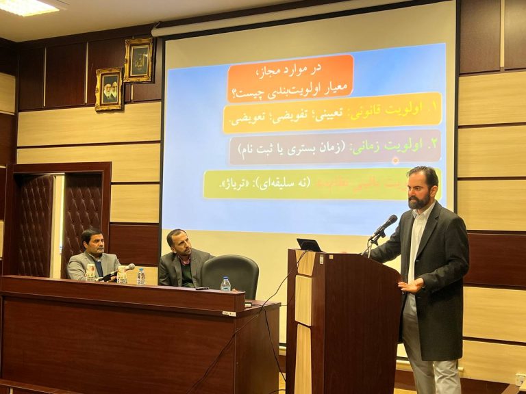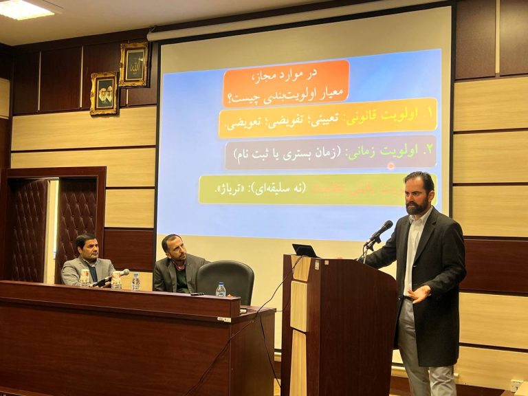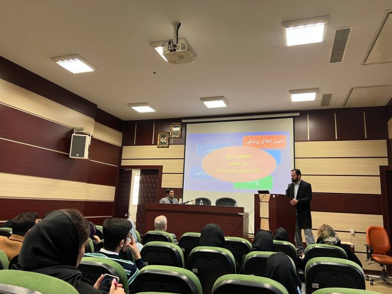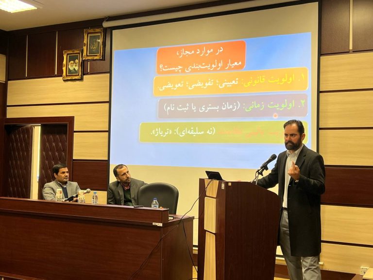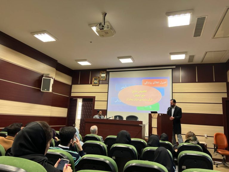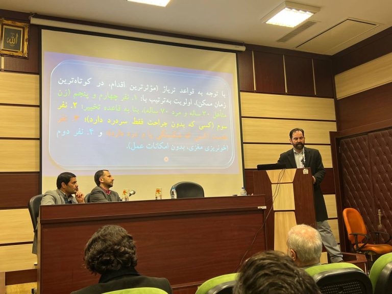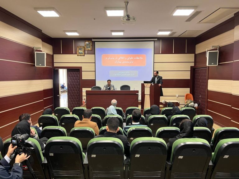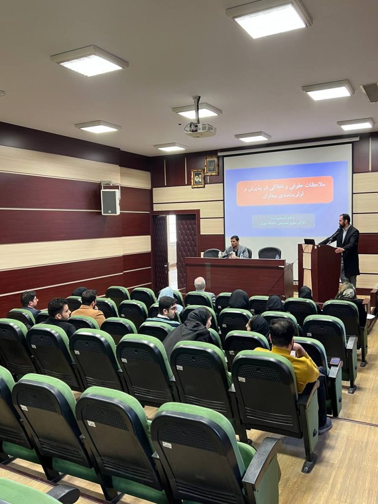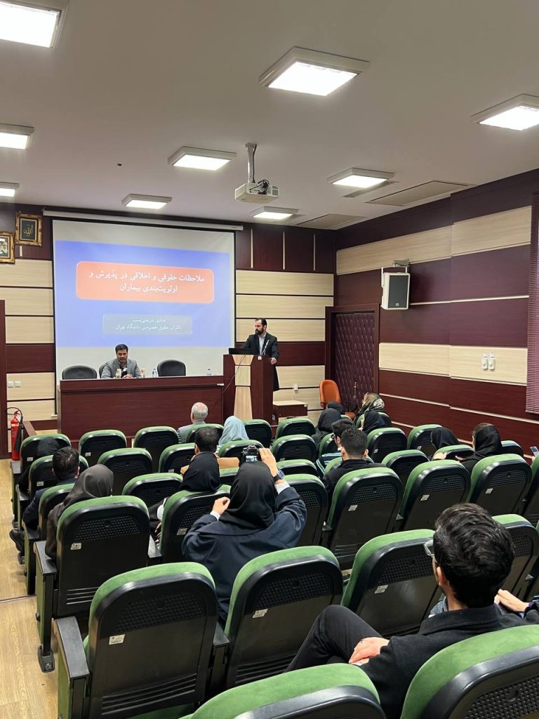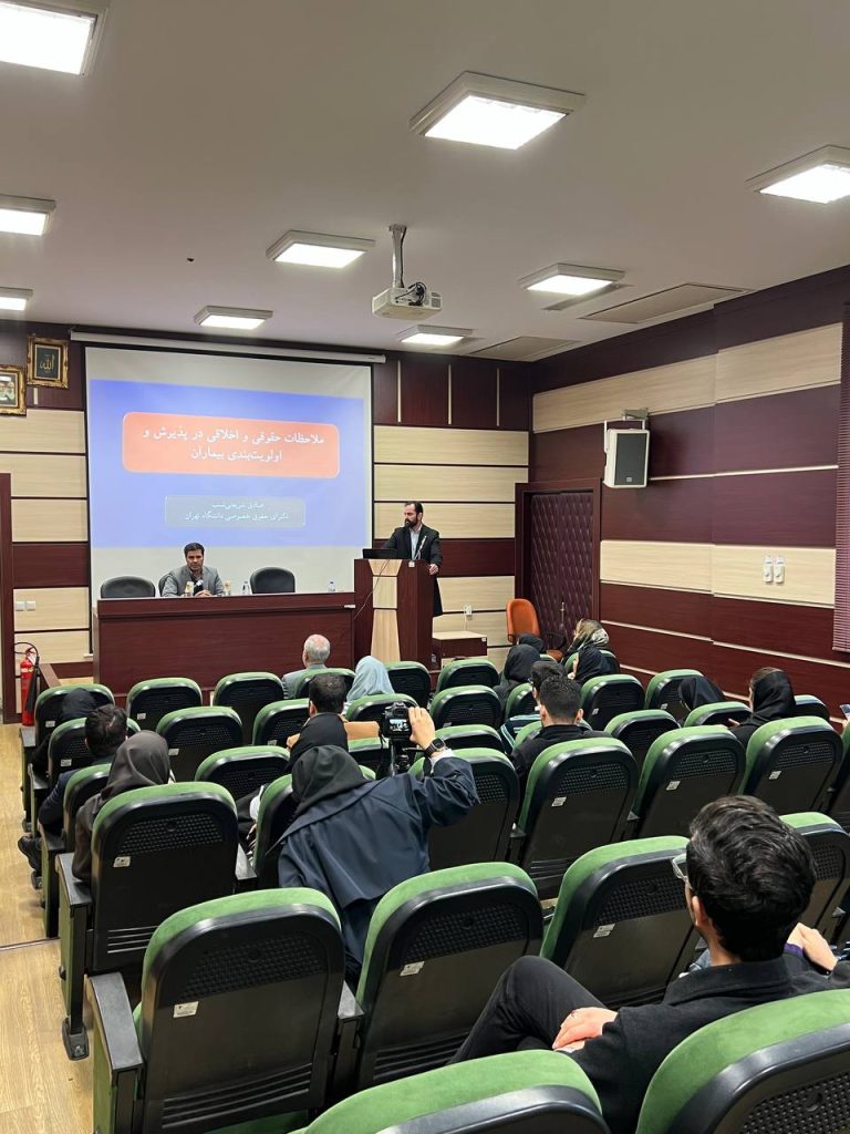 در ابتدا دکتر شریعتی نسب با بیان چند مسئله و چالش اخلاقی در حوزه خدمات تشخیصی و درمانی به تعریف و تحدید حدود اخلاق و حقوق پزشکی پرداختند و ضمن بیان تعریف اولویت بندی بیماران در پذیرش از دید علم اخلاق پزشکی به بررسی چالش های حقوقی این موضوع پرداختند.